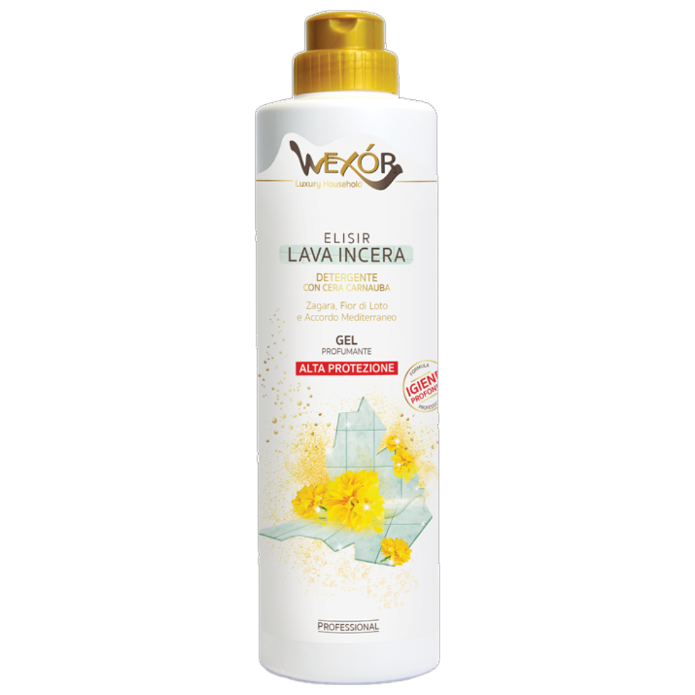 Wexór Elisir LAVA INCERA Detergente In Gel Con Cera Carnauba Igienizzante. Profumo Intenso Di ZAGARA, FIOR DI LOTO e ACCORDO MEDITERRANEO a Lento Rilascio Grazie Alle Microcapsule 750ml